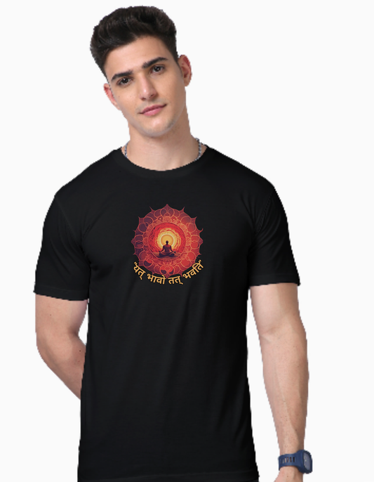Regular Fit Round Neck Black Cotton T-Shirt with Sanskrit Typography - यत् भावो तत् भवति (As You Feel, So You Become)
