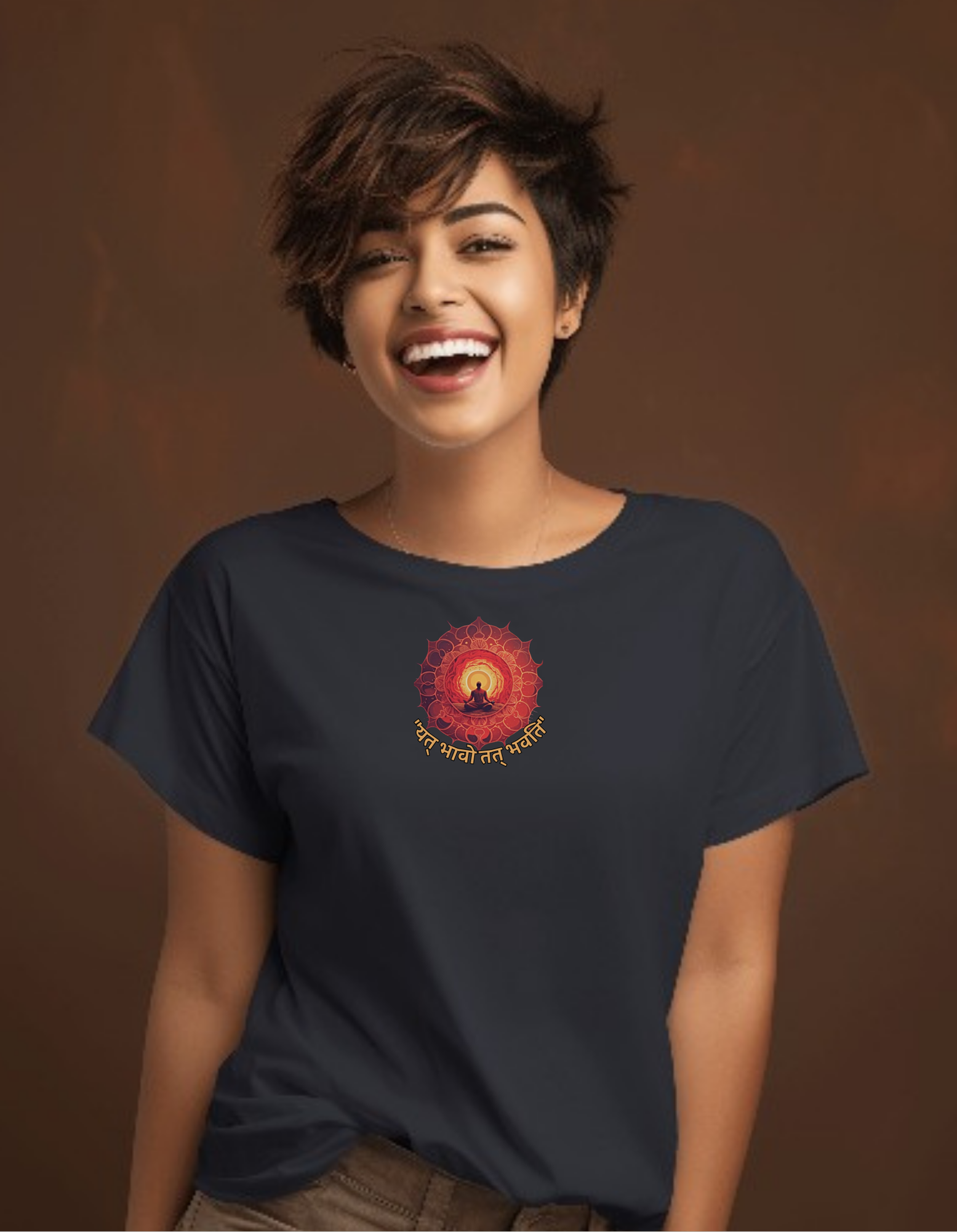 Oversized Drop Shoulder Round Neck Coffee Brown Cotton T-Shirt with Sanskrit Typography - अनुगच्छतु प्रवाह (Go with the Flow)