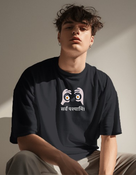 Oversized Drop Shoulder Round Neck Black Cotton T-Shirt with Sanskrit Typography - सर्वं पश्यामि (I See All)