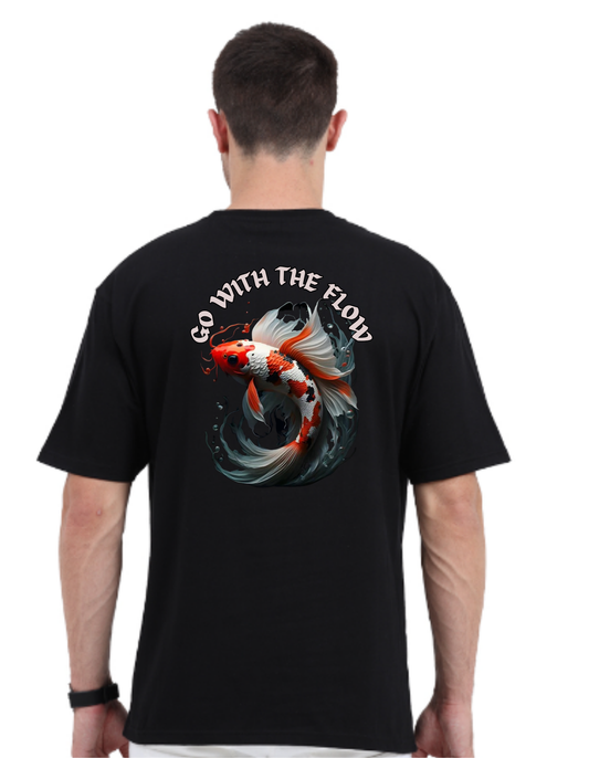 Oversized Drop Shoulder Round Neck Black Cotton T-Shirt with Sanskrit Typography - अनुगच्छतु प्रवाह (Go with the Flow)